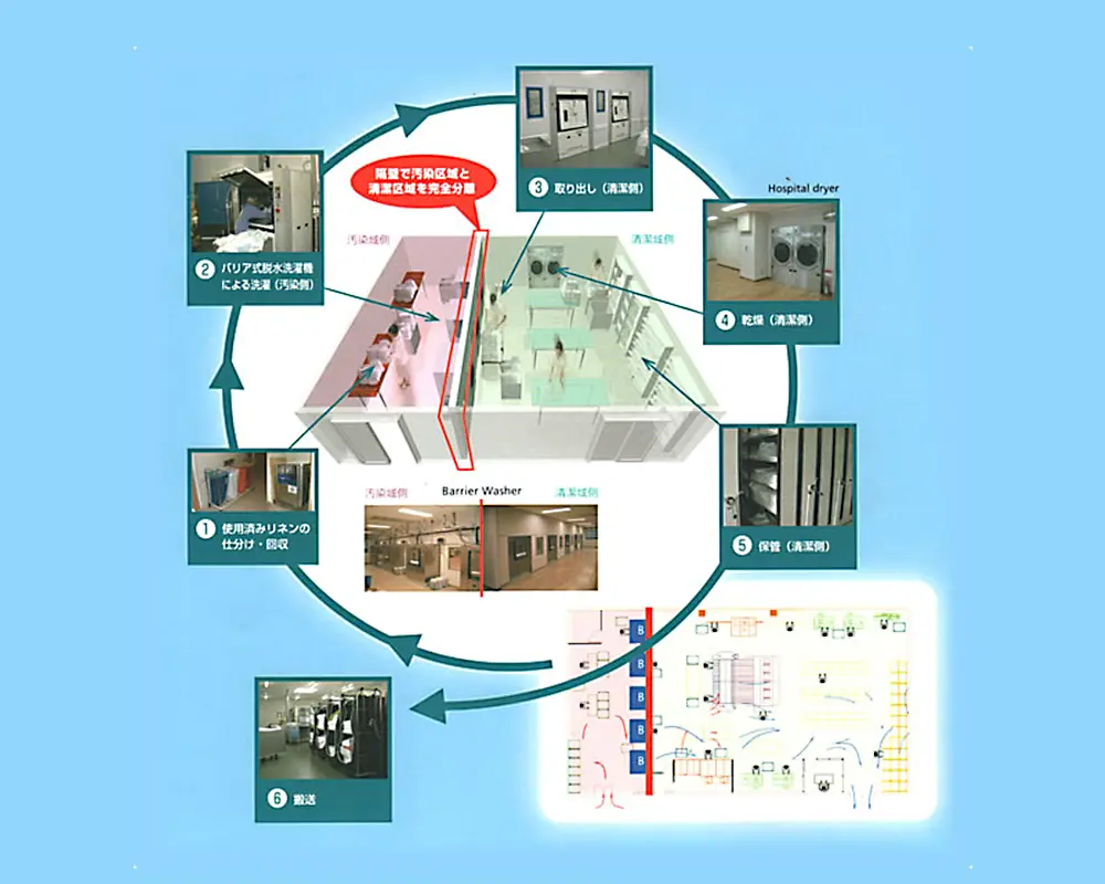 パススルー方式にて、処理前リネンと処理後リネンの交差を回避するバリアランドリーシステム。